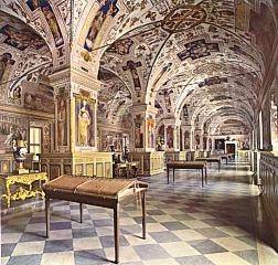 Сами залы библиотеки представляют собой огромную ценность, так как расписаны фресками известнейших итальянских мастеров. Когда-то библиотека находилась в помещениях, которые были украшены работами Доменико Гирландайо, Мелоццо да Форли и Антониаццо Романо. Потом ее переместили в новое здание, которое в 1587 году построил Доменико Фонтана. Так как места не хватало, то строение разместили поперек двора Бельведера, что нарушил архитектурный замысел Браманта. В 1611 году был устроен Зал бракосочетания Альдобрандини, в котором сегодня находятся античные фрески: «Бракосочетание Альдобрандини», «Подвиги Самсона» Гвидо Рени и фрески, на которых запечатлены сцены из «Одиссеи» (около IV до н. э.). В зале папирусов хранились «равеннские папирусы» VI—IX веков, зал был создан в 1774 году , потолок в нем был расписан Рафаэлем Менгсом. Сейчас там выставлены золотые кубки, на которых изображены сцены светской, иудейской жизни и на хрисианскую тематику. В 1690 году папа Александр приказал построить еще один зал, который сегодня называют его именем - Зал Александра. Его расписывал Доменико де Анджелис в начале 19 века, воссоздав на фресках историю жизни смерти папы Пия VI, плененного наполеоном. Джованни Батиста Риччи расписывал два Зала, посвященных папе Павлу V. Палатинская библиотека хранится в Галерее Урбана VIII, в которой также можно увидеть старинные астрономические приборы. В 1756 году папа Бенедиктом XIV решил создать отдельный зал для вещей раннехристианской эпохи. Так появился Музей сакрального искусства апостольской библиотеки, в котором находятся кубки, изделия из стекла и металла, лампы из бронзы и глины, икона святого Феодора XII—XIII века. Есть и музей светского искусства, в нем экспонируются предметы римской и этрусской культур. |